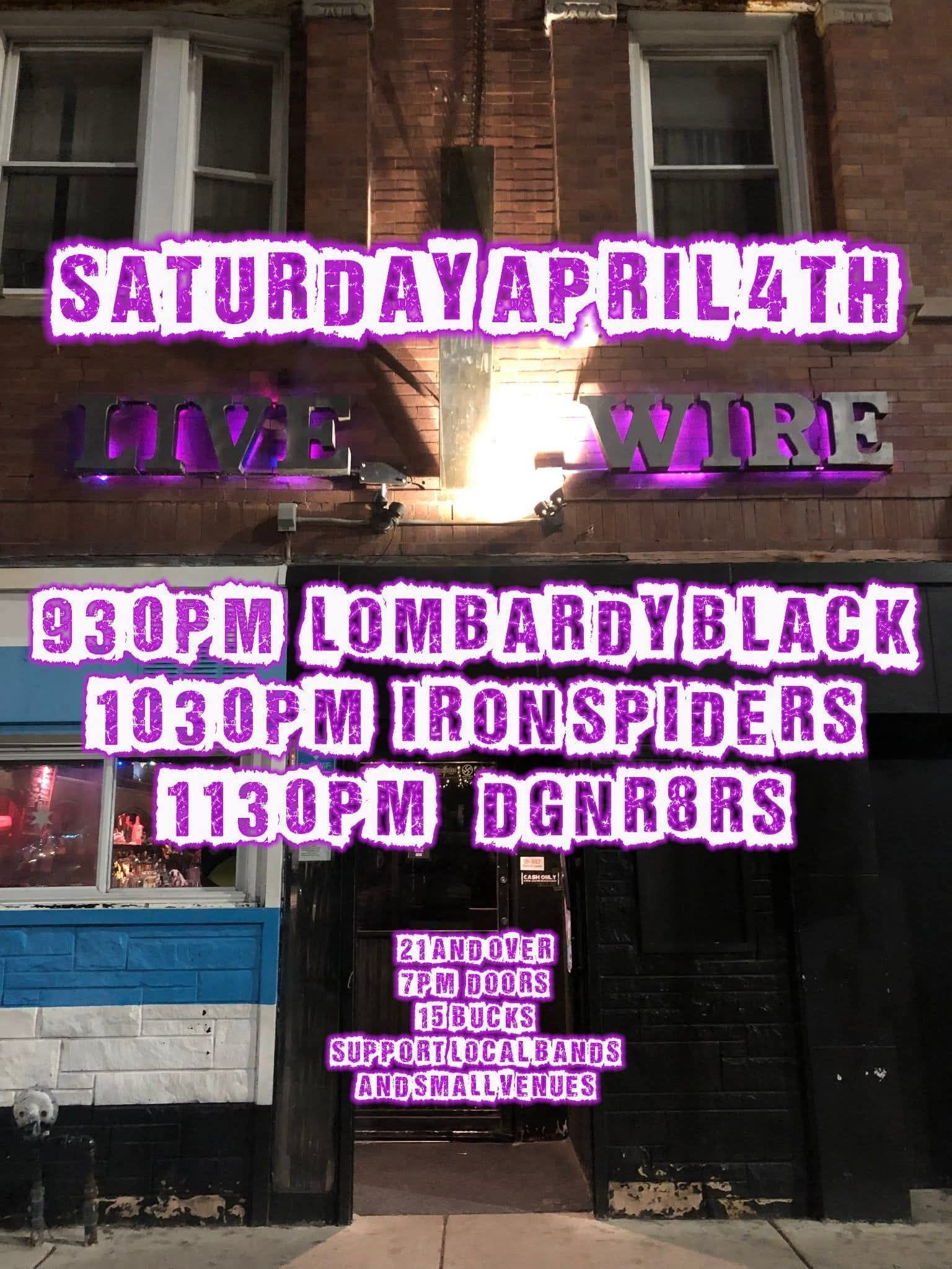 Saturday Night RocksThe Iron Spiders , Lombardyblack , Dgnr8rs📅 April 4, 2026, doors: 3:00PMVenue details🏛️ Live Wire📍 3394 N Milwaukee Ave, Chicago, IL 60641🔗 More Info